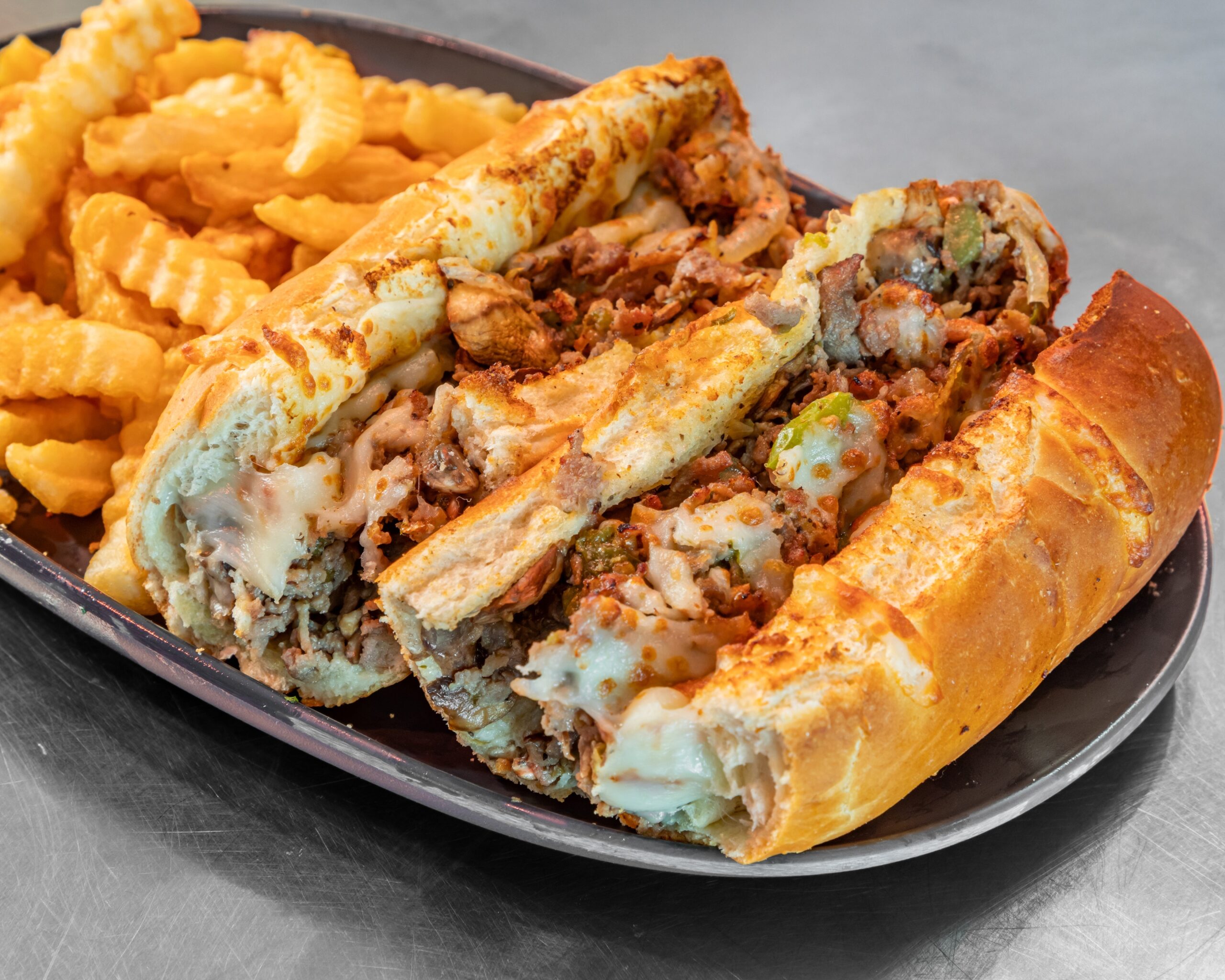 Meatballs, mozzarella cheese, shaved Parmesan, and marinara sauce on 12” Italian hoagie. Served with fries.