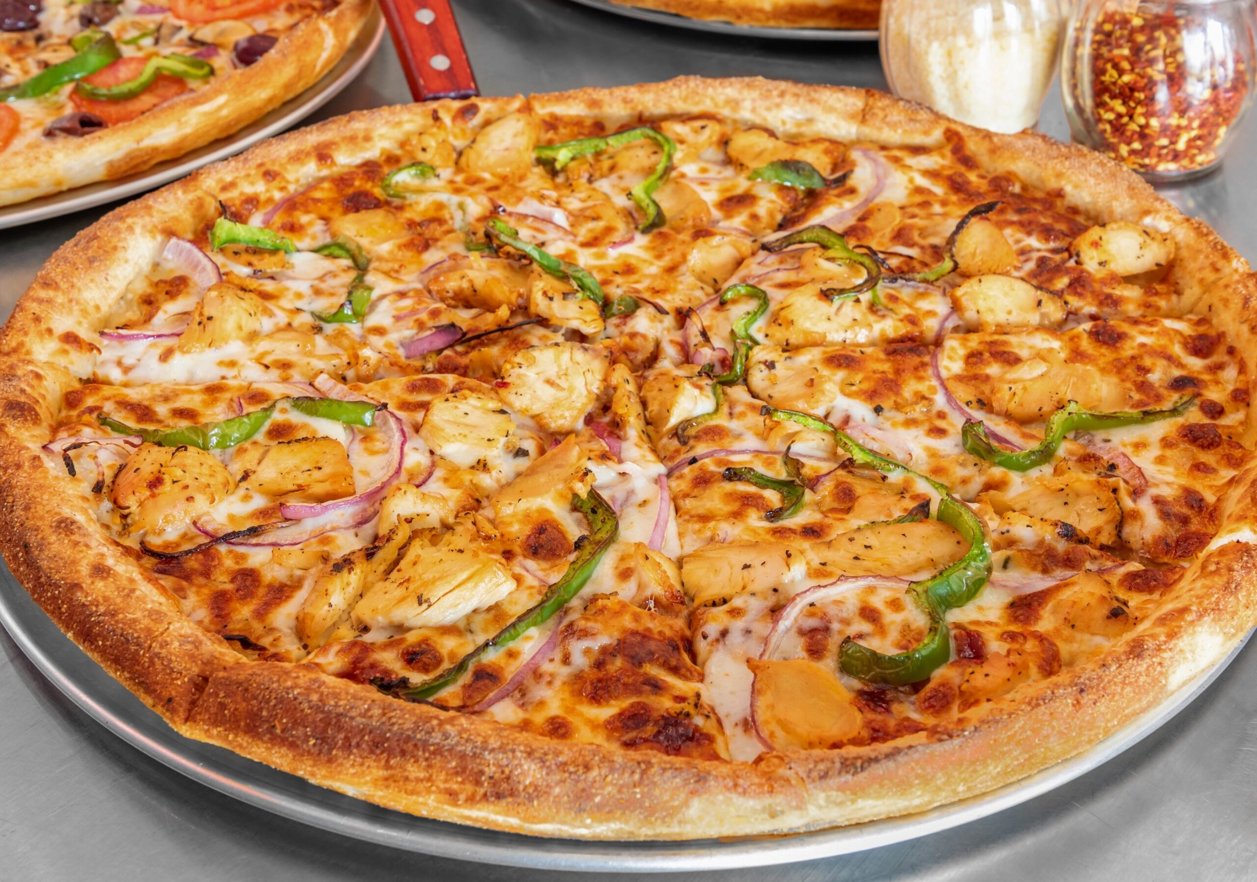 Olive garlic sauce, mozzarella cheese, grilled chicken, onions, tomatoes & roasted garlic