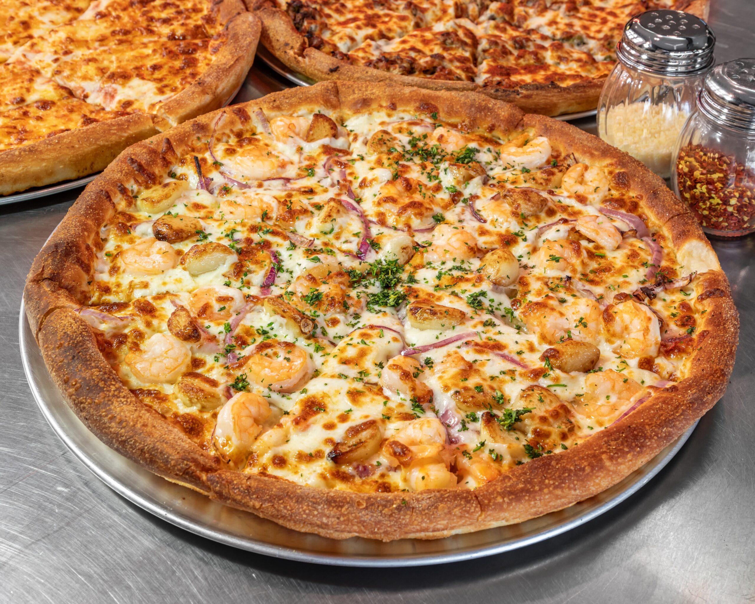 Garlic butter sauce, mozzarella cheese, sautéed shrimp, onions, roasted garlic & parsley